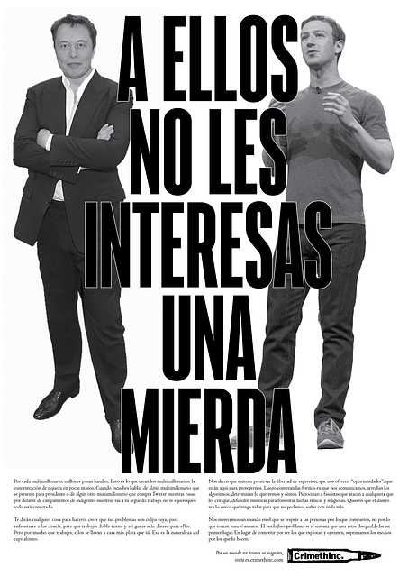 Nos dicen que quieren preservar la libertad de expresión, que nos ofrecen “oportunidades”, que están aquí para protegernos. Luego compran las formas en que nos comunicamos, arreglan los algoritmos, determinan lo que vemos y oímos. Patrocinan a fascistas que atacan a cualquiera que les critique, difunden mentiras para fomentar luchas étnicas y religiosas. Quieren que el dinero sea lo único que tenga valor para que no podamos soñar con nada más.