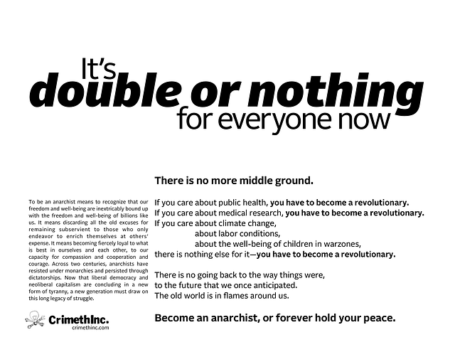 To be an anarchist means to recognize that our freedom and well-being are inextricably bound up with the freedom and well-being of billions like us. It means discarding all the old excuses for remaining subservient to those who only endeavor to enrich themselves at others’ expense. It means becoming fiercely loyal to what is best in ourselves and each other, to our capacity for compassion and cooperation and courage. Across two centuries, anarchists have resisted under monarchies and persisted through dictatorships. Now that liberal democracy and neoliberal capitalism are concluding in a new form of tyranny, a new generation must draw on this long legacy of struggle.