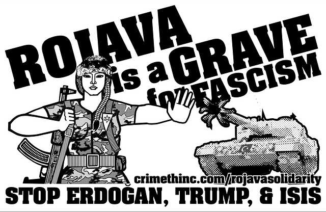 With nationalism growing worldwide, the Turkish invasion of Rojava for the purpose of ethnic cleansing and resettlement is the equivalent of late-1930s German expansionism. This poster honors the participation of the YPJ (Yekîneyên Parastina Jin, Women’s Defense Units) in the defense of Rojava.