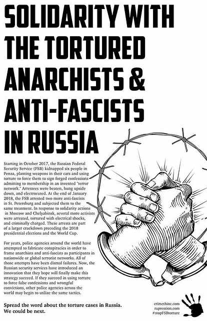 Starting in October 2017, the Russian Federal Security Service (FSB) kidnapped six people in Penza, planting weapons in their cars and using torture to force them to sign forged confessions admitting to membership in an invented “terror network.” Arrestees were beaten, hung upside down, and electrocuted. At the end of January 2018, two more antifascists were arrest in St. Petersburg and subjected to the same treatment. In response to solidarity actions in Moscow and Chelyabinsk, additional activists have been arrested, tortured with electrical shocks, and criminally charged. These arrests are part of a larger crackdown proceeding the 2018 presidential elections and the World Cup.
