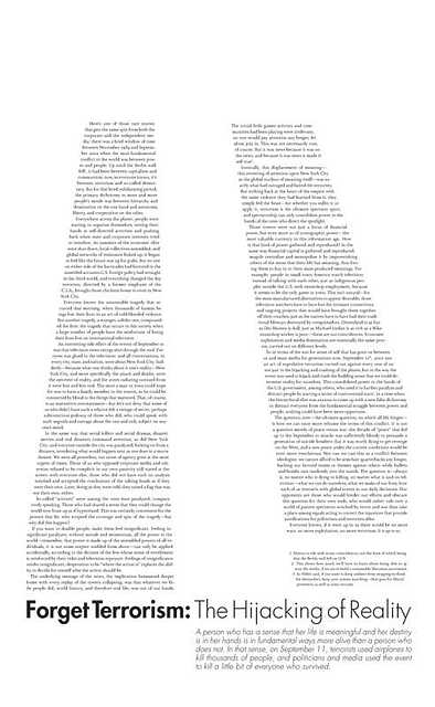 A large full-color poster printed on white book paper, made to be deployed in a variety of environments, from handing out at rallies or family reunions, or for use in decorating your dorm or cubicle— perhaps, just perhaps, even for wheatpasting! It uses a strong image (that coincidentally is a real photo, and not photoshopped) while the headline and body text pose questions that play on the emotional impact of the image. The back contains the essay Forget Terrorism: The Hijacking of Reality.