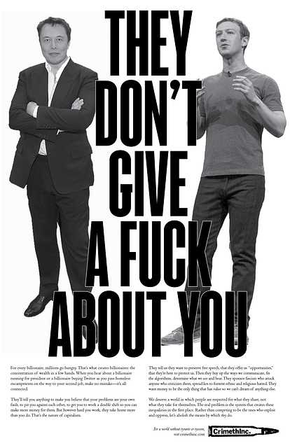 For every billionaire, millions go hungry. That’s what creates billionaires: the concentration of wealth in a few hands. When you hear about a billionaire running for president or a billionaire buying Twitter as you pass homeless encampments on the way to your second job, make no mistake—it’s all connected.